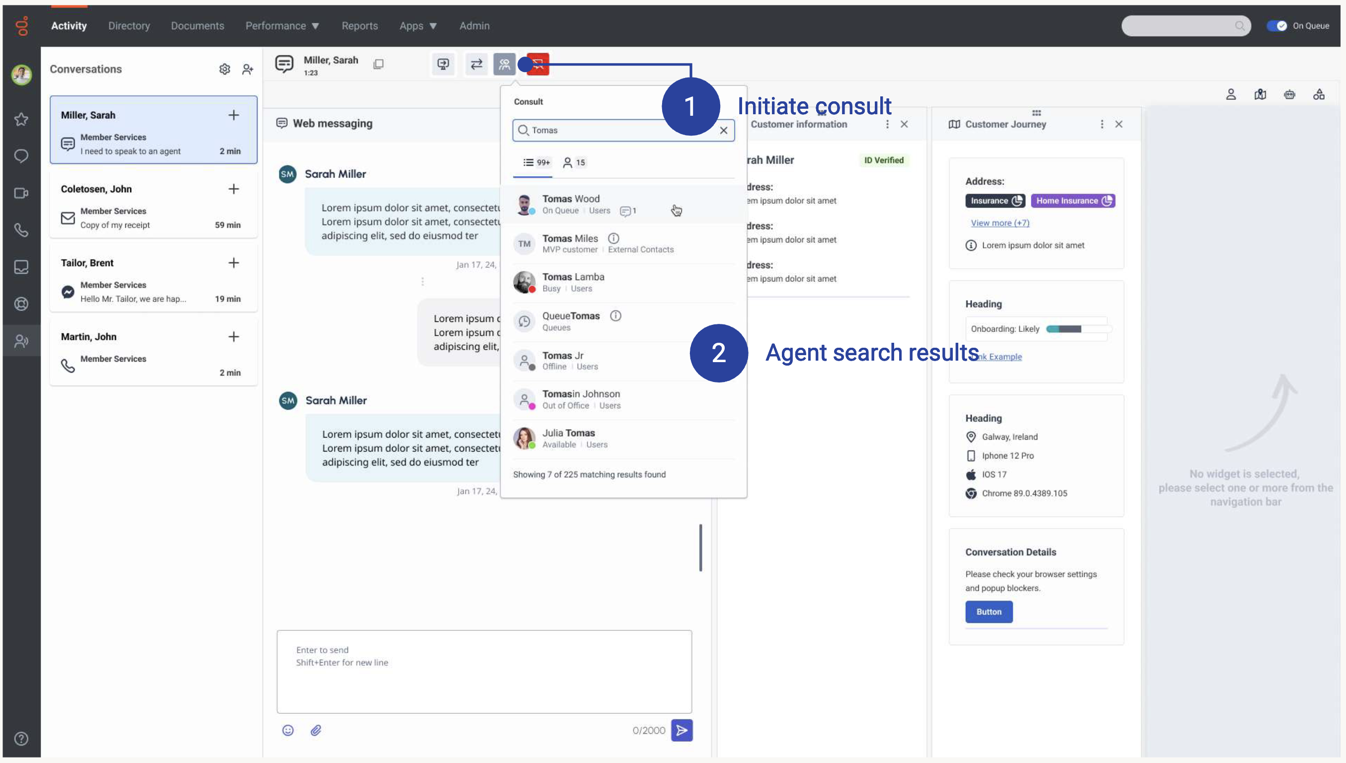The consulted agent will also see the ongoing customer conversation, giving them immediate context and enabling a smoother transition. For more visual information, see the following sections.