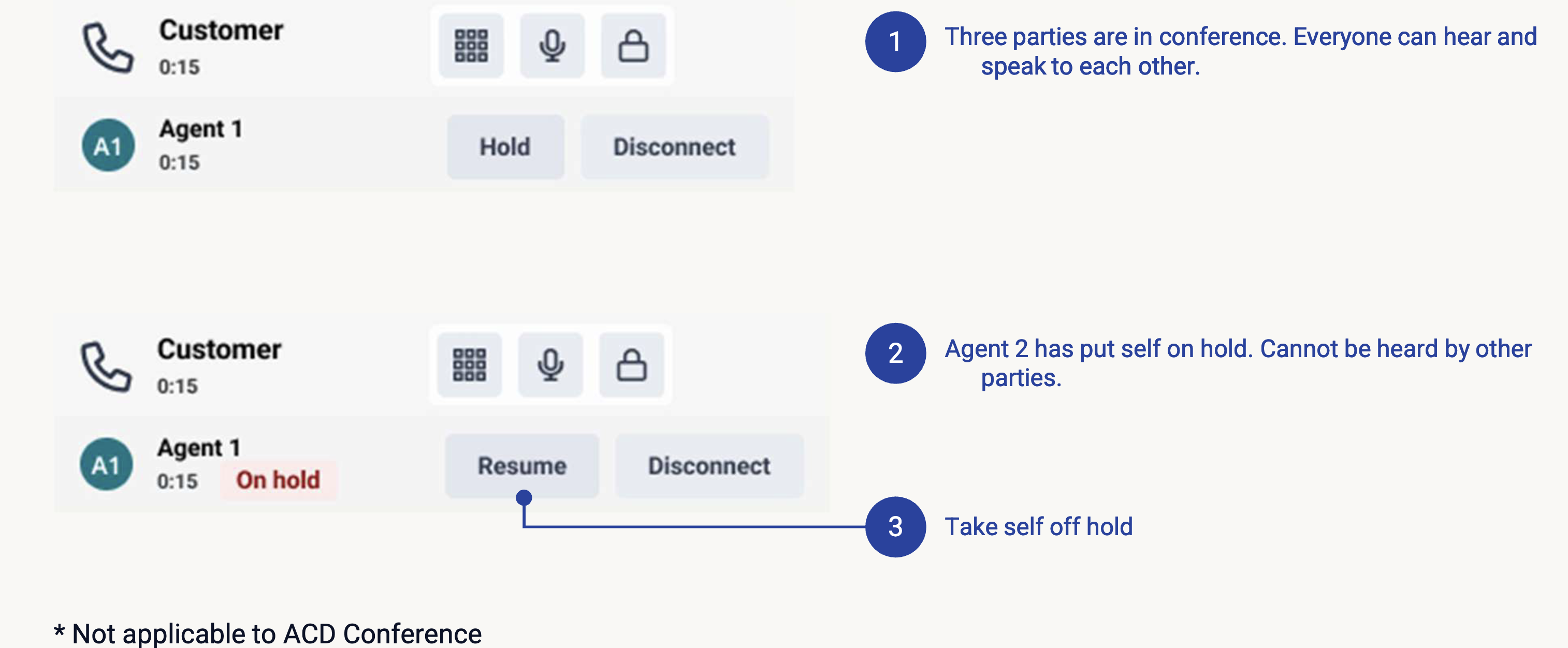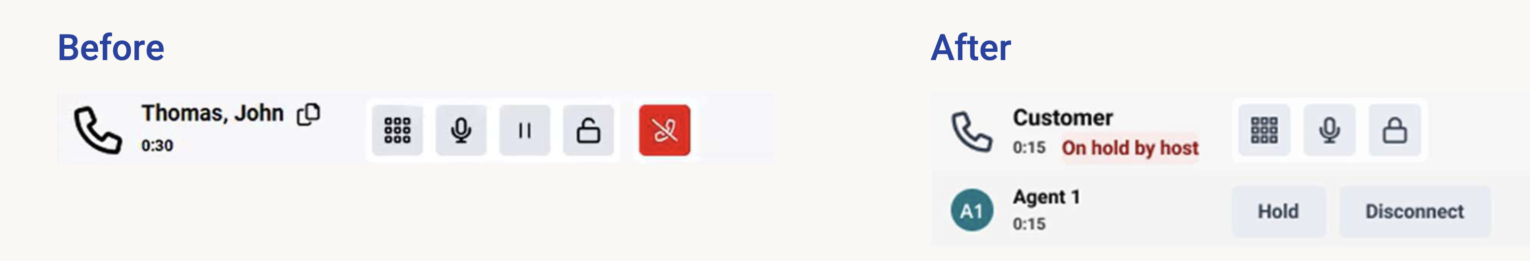 In addition, the updated experience for voice consultations will include clearer details; for example, the consulting agent’s name, the duration of the consult, and which party is on hold, along with new, dedicated call controls. This change improves first contact resolution, makes better use of subject matter experts, and gives agents more flexibility in managing their workload, all while reducing effort for customers who must no longer repeat themselves. For more visual information, see the following sections.