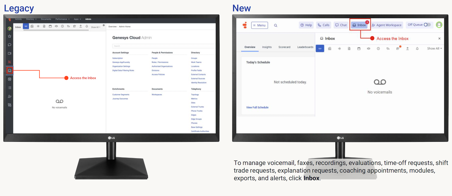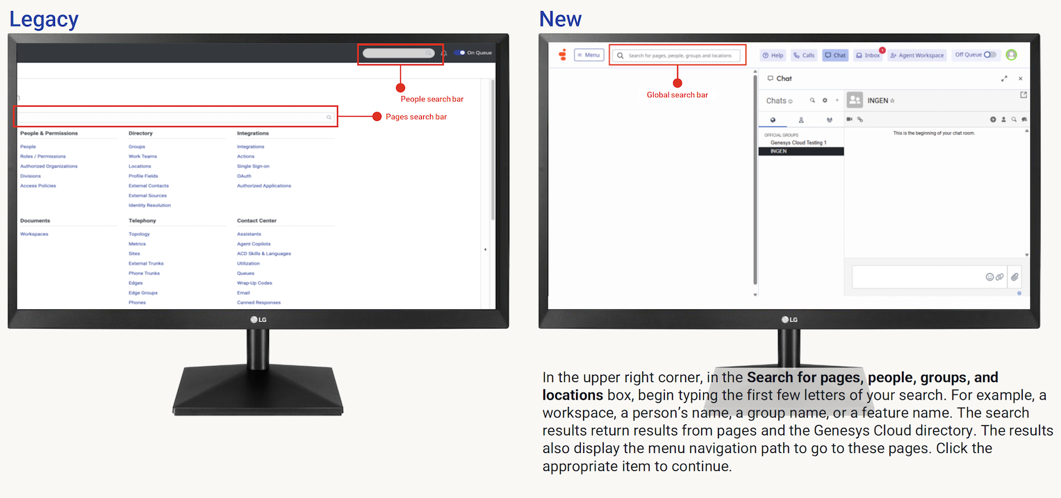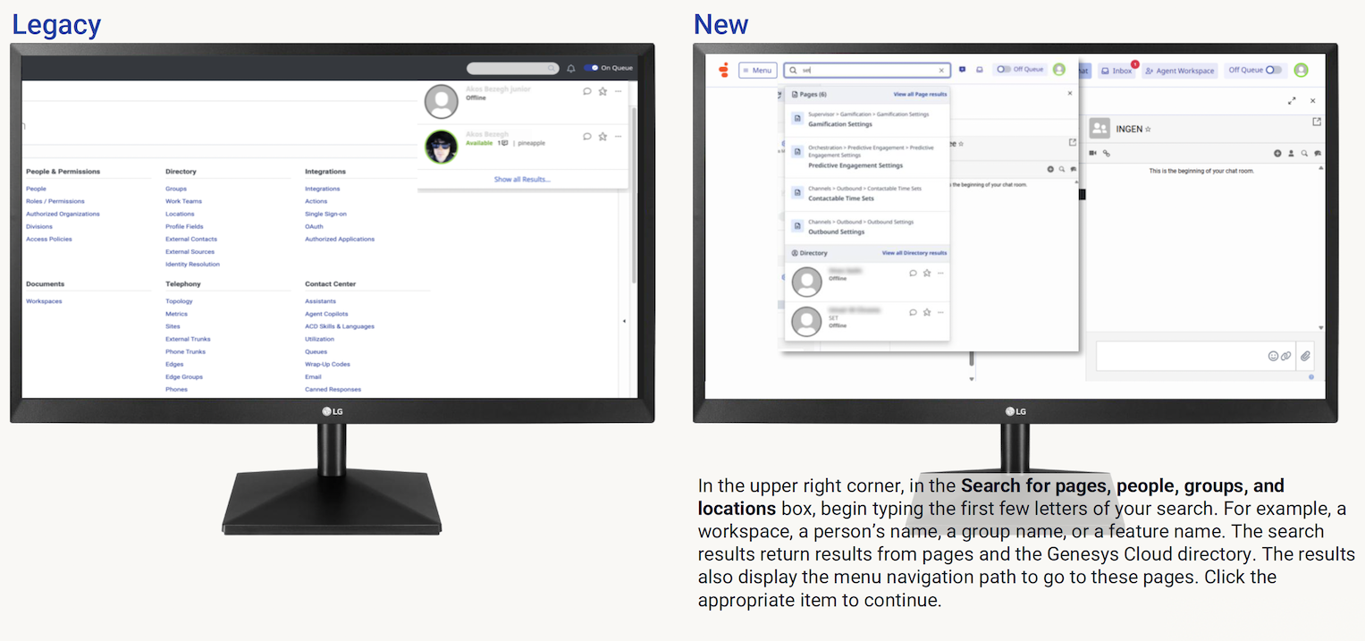 For more information, see Explore the Genesys Cloud interface, New unified navigation experience coming to Genesys Cloud community post, and the Release Notes.
