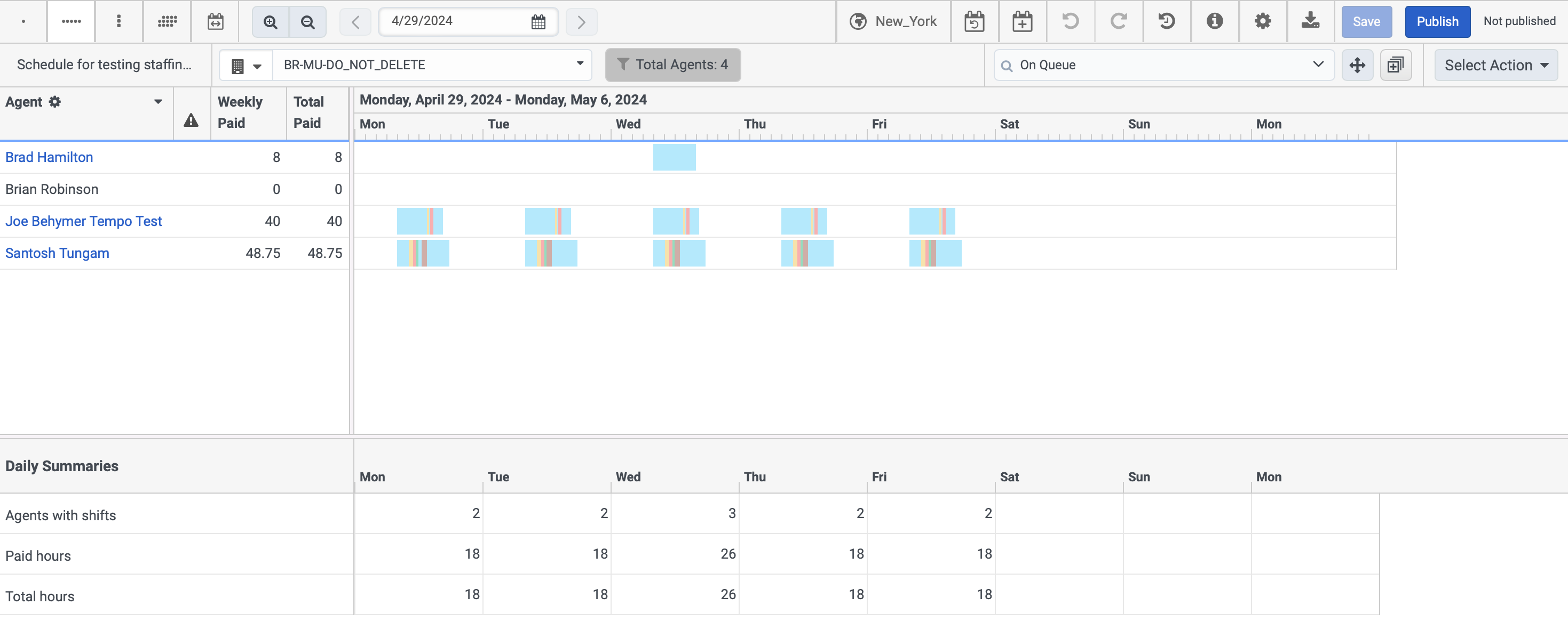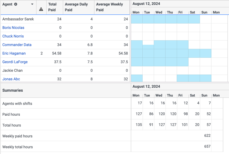 The Average Daily Paid column displays the hours that the agents work during the day and does not consider the night hours logged when it is a night shift. The average daily calculations includes the length of the shift spent during the day. For example, A 10 PM Tuesday - 6 AM Wednesday shift counts as 8 hours for Tuesday, and not 2 hours for Tuesday, 6 hours for Wednesday. The Average Weekly Paid column displays the hours that the agents during the entire week. |