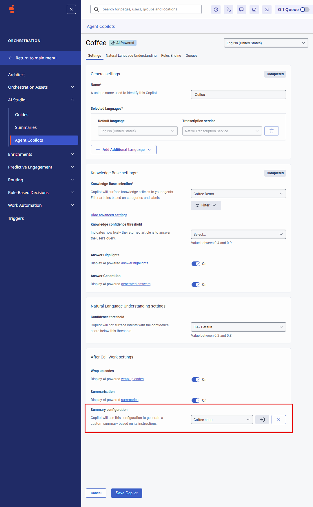 Before you can assign an AI Studio summary configuration to an Agent Copilot, you must first add it in the AI Studio view. For more information, see Add and manage an AI Studio summary.