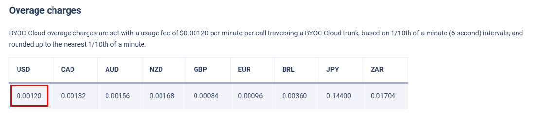 After you know the number of minutes for which to be billed, you can look up the rate per overage minute. For more information, see Genesys Cloud fair use policy. For this customer, who is billed in USD, the overage rate is $0.00120 per minute.