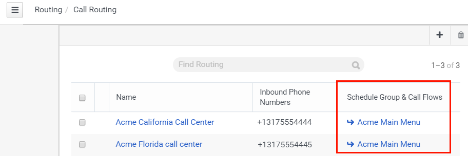 Notice that both call centers include the same primary call flow for schedule-based routing: