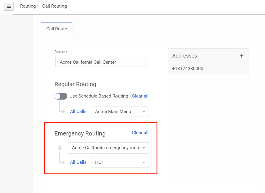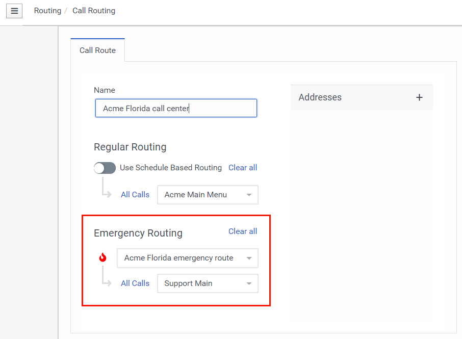 Assume you have a call center in Florida and a call center in California. If the Florida call center has an emergency; for example a fire alarm that requires evacuation of the building, the emergency will not affect the California office. In this situation, you can create a call route for the Florida office and a call route for the California office. Then, configure emergency routing for each call center.