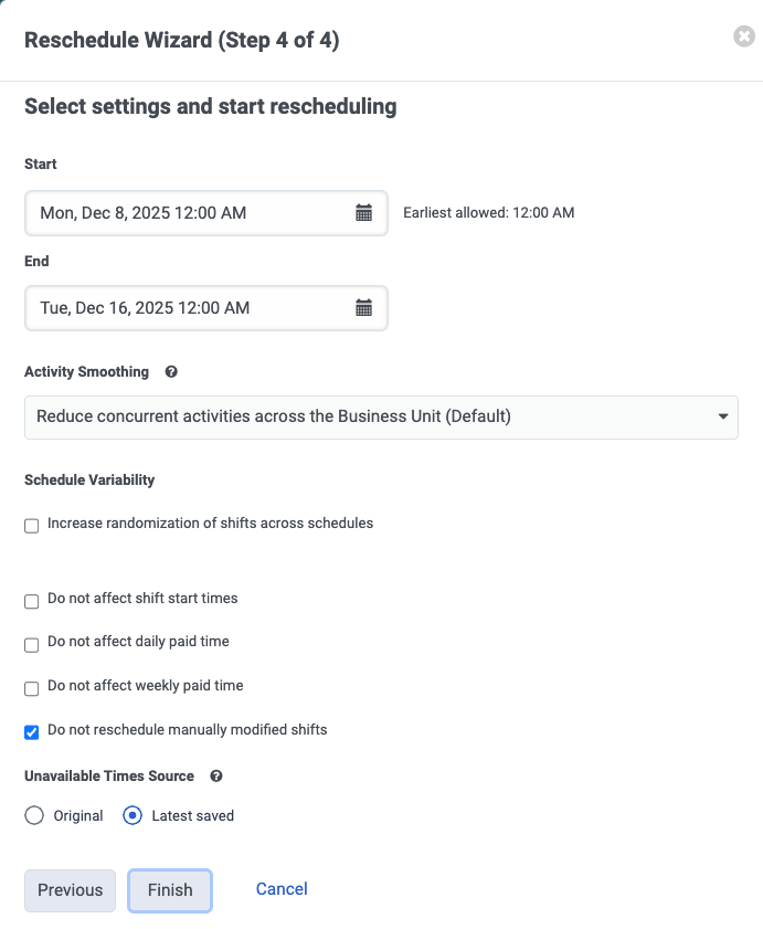 - Click Finish. Workforce management confirms the completion of rescheduling and also indicates the number of management units to which the new schedule applies.
