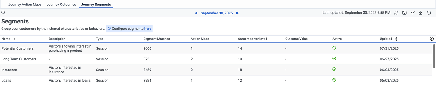 The Journey segments report displays the performance of specific segments of visitors and how well you are engaging them. For example, the number of outcomes that were achieved by session segments and customer segments.