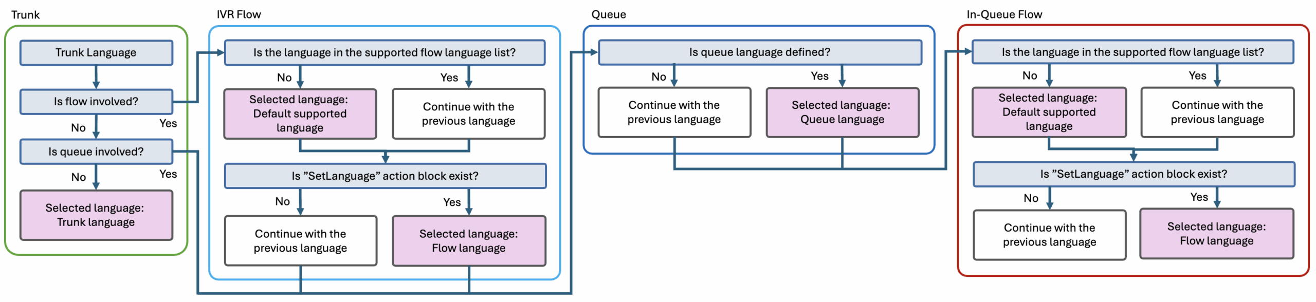 An agent can answer the call at any time, potentially interrupting the process during Step 3 or Step 4. In these cases, the final language value is the one active at the moment the agent answers the call. Future improvements will introduce safeguards to ensure this logic remains consistent, even when agents are immediately available in the queue.