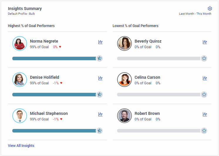 The Insights Summary widget lets you see the top three highest and the three lowest performing agents for the selected time period.