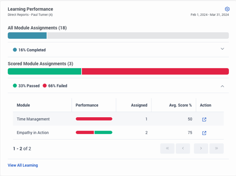 - Scored Module Assignments: This indicator shows scored assignments only, and displays the ratio of Pass/Fail for any completed assignments.