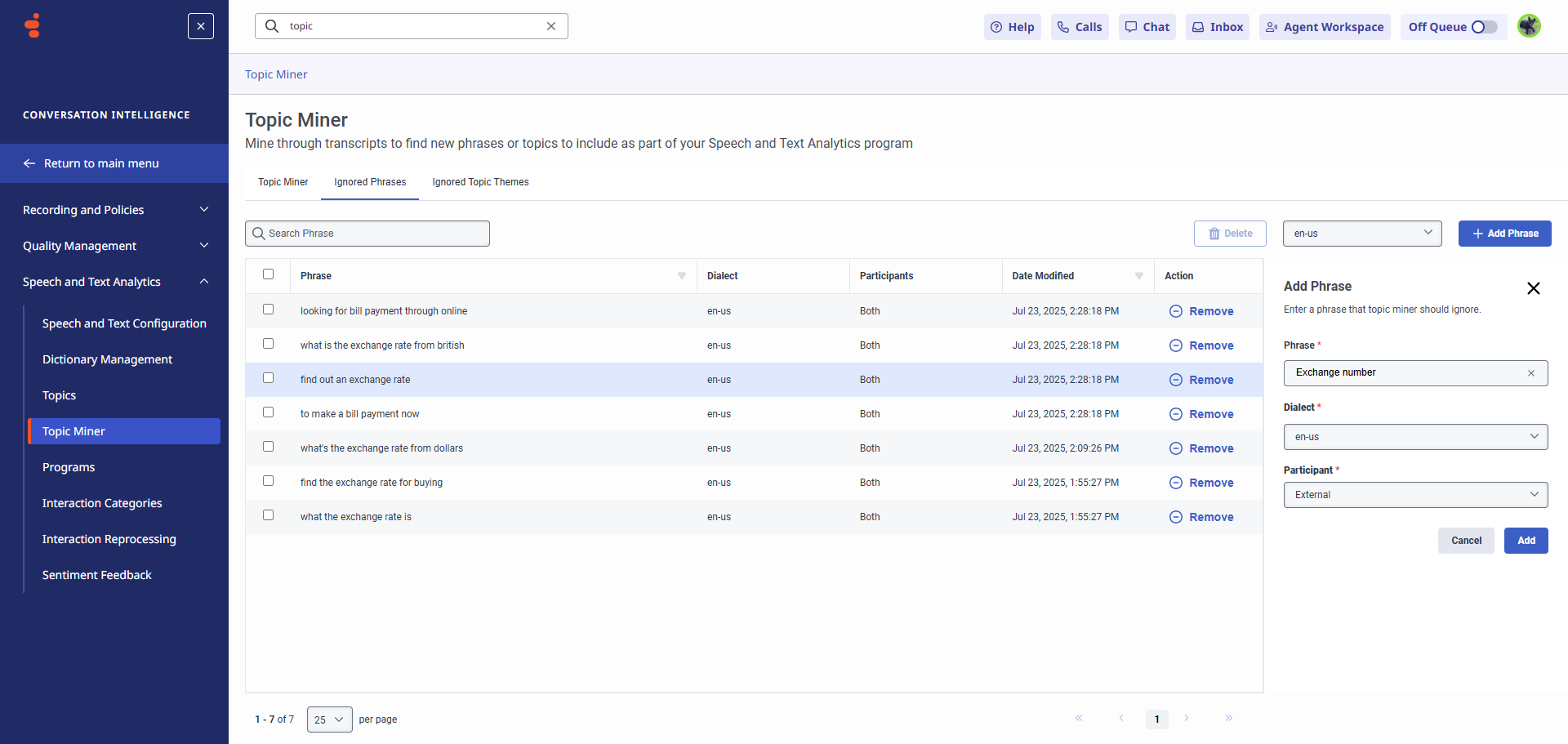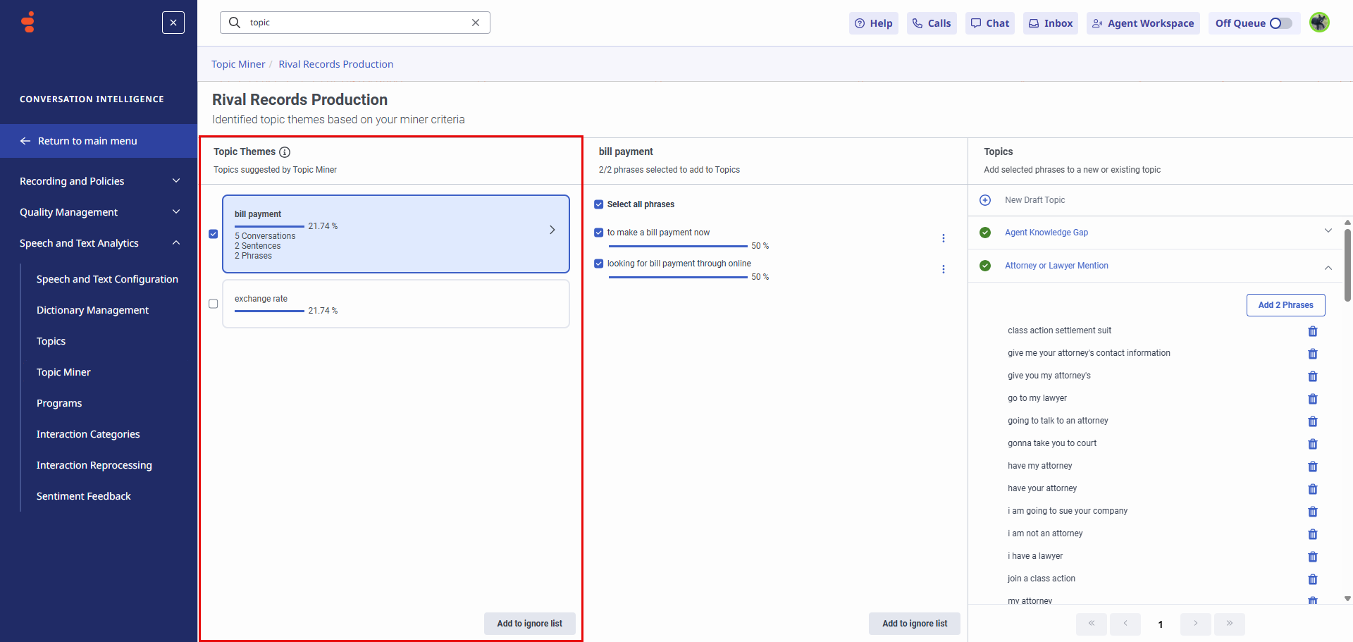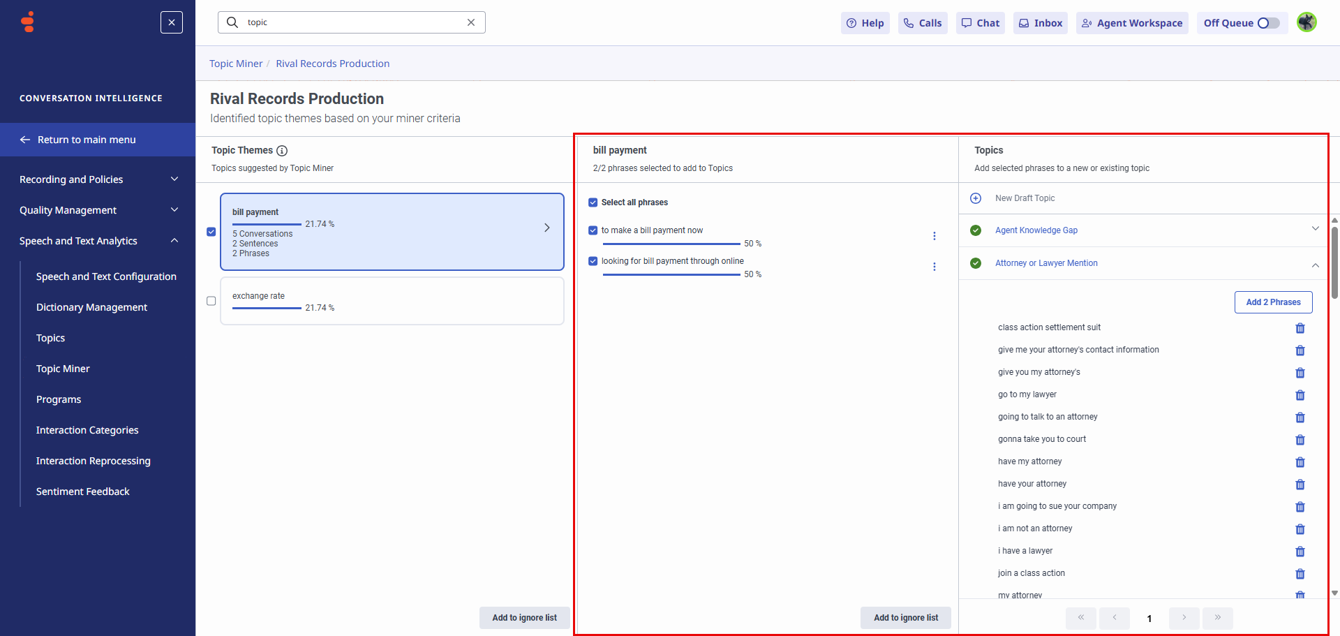 - Click Menu > Conversational Intelligence > Speech and Text Analytics > Topic Miner.