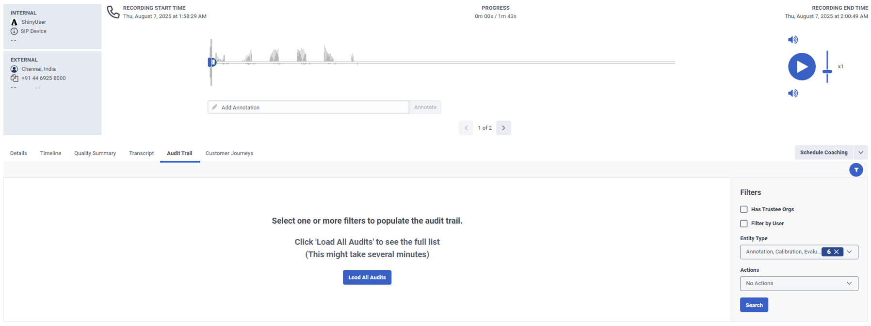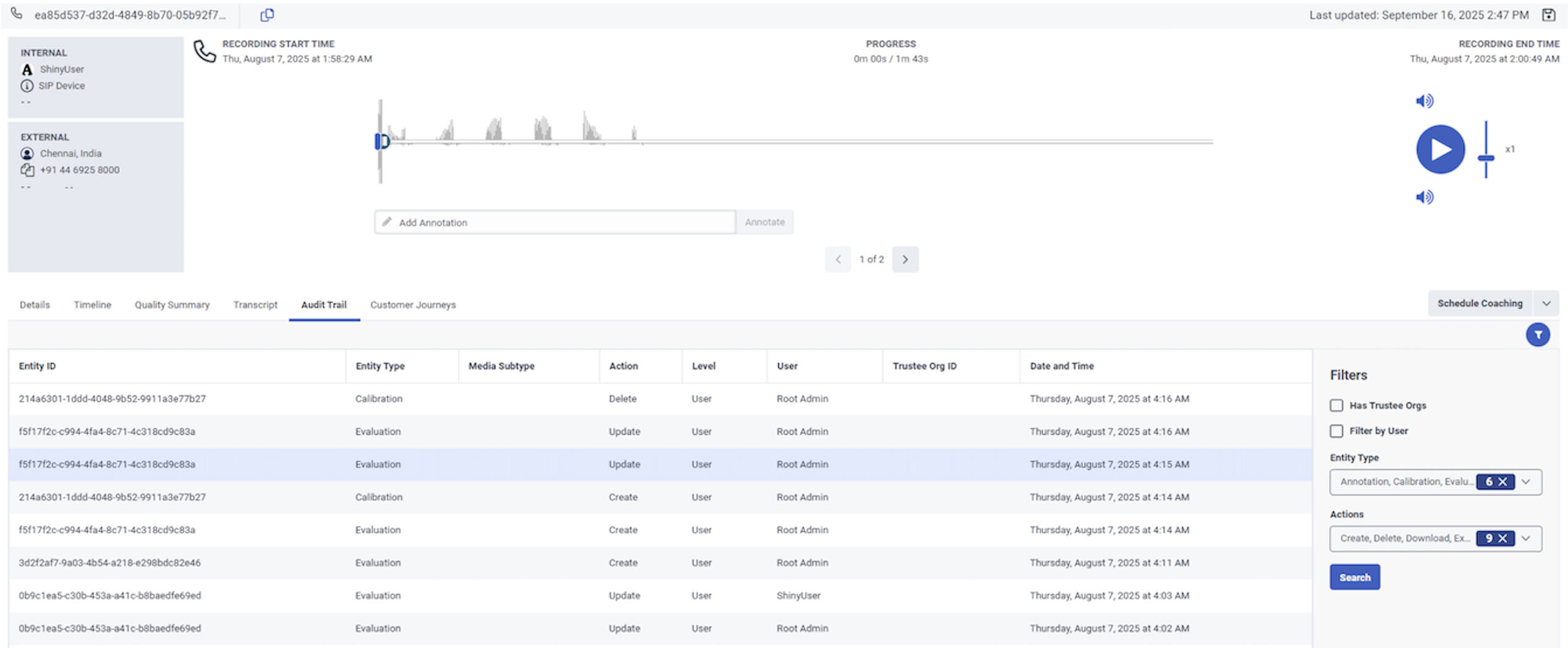 The Audit Trail tab displays a history of how users accessed or changed the interaction, including access to the recordings or changes to annotations, evaluations, and calibrations.