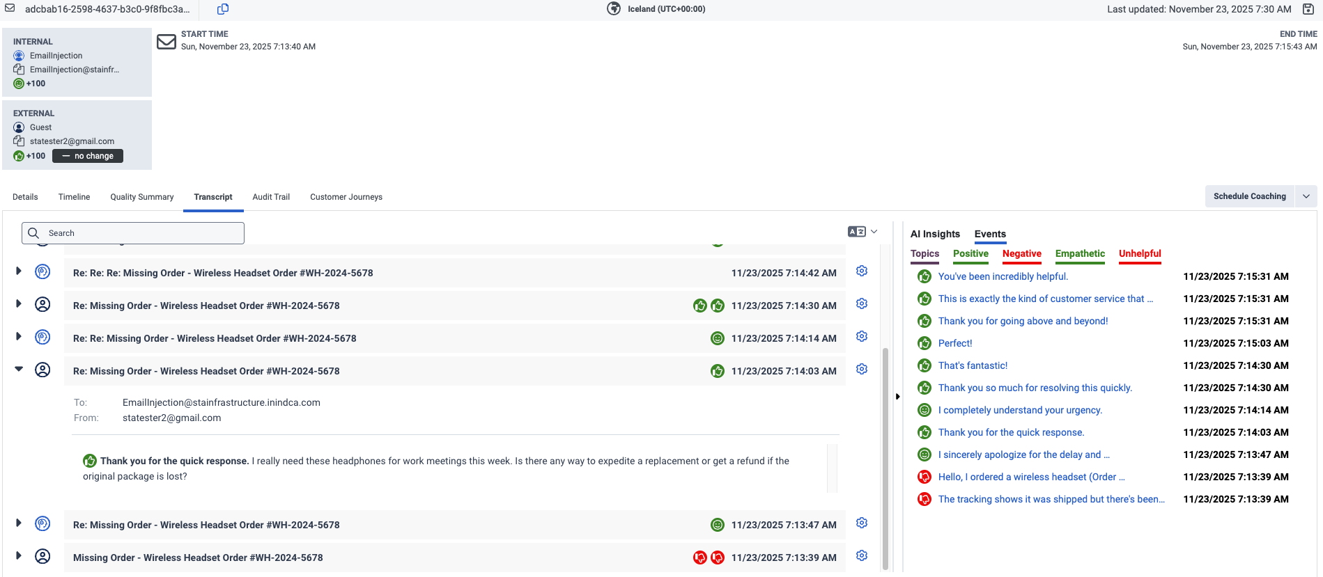 - Navigate to the interaction that you want to review. Ensure that the interaction contains a transcription (digital message, or email body).