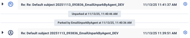 - Within an email transcript, there is a visual indicator about the program associated with the transcript content, dialect, park interaction, and unpark interaction.