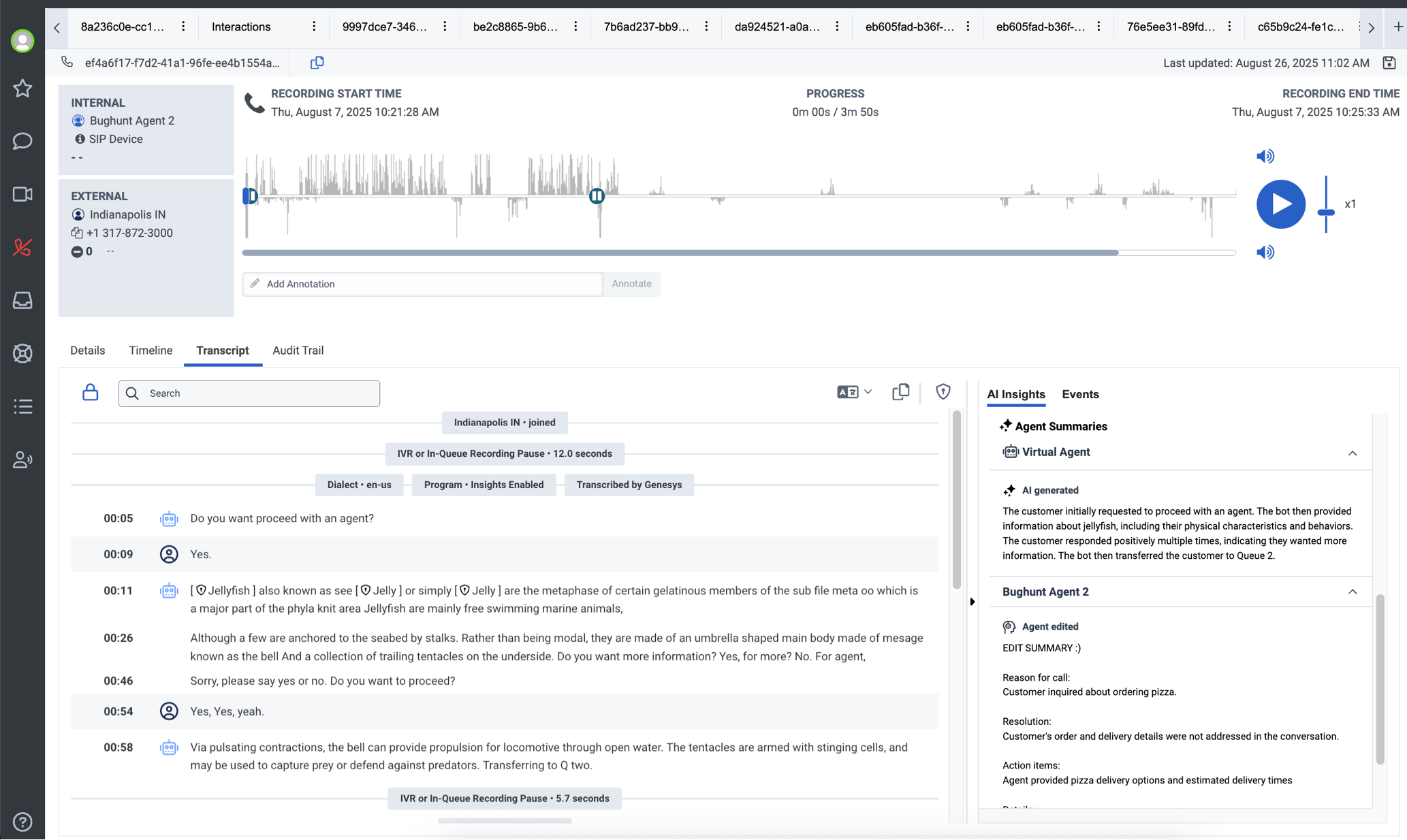- If an interaction includes multiple agents, a single interaction-level summary is displayed.