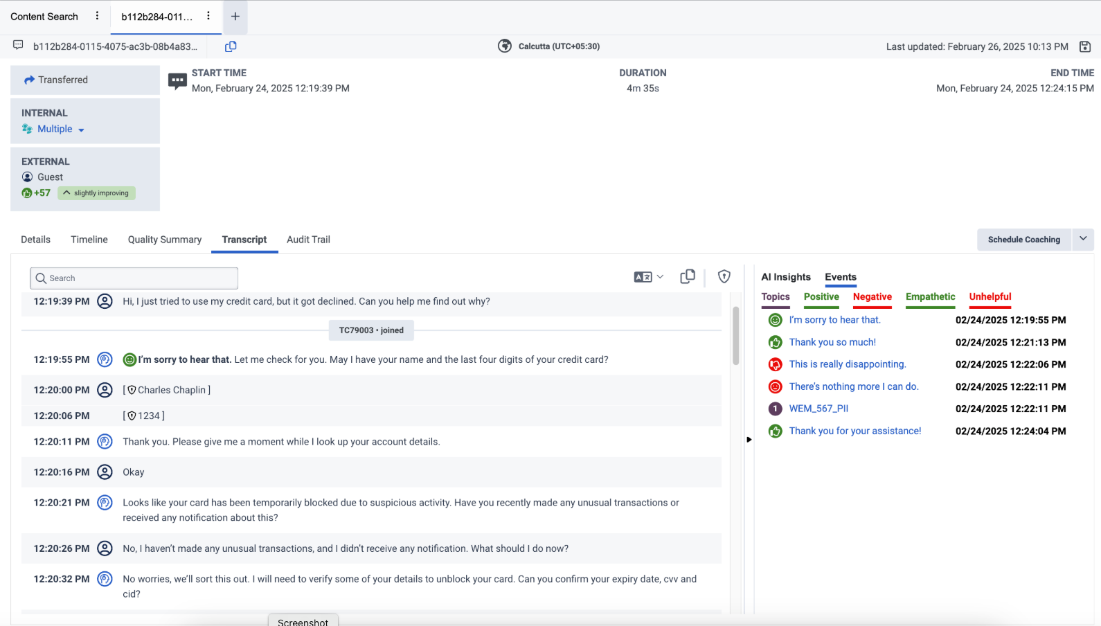- Detect trends and friction points — Spot patterns across interactions, such as recurring complaints or process inefficiencies, that may be impacting customer satisfaction.
