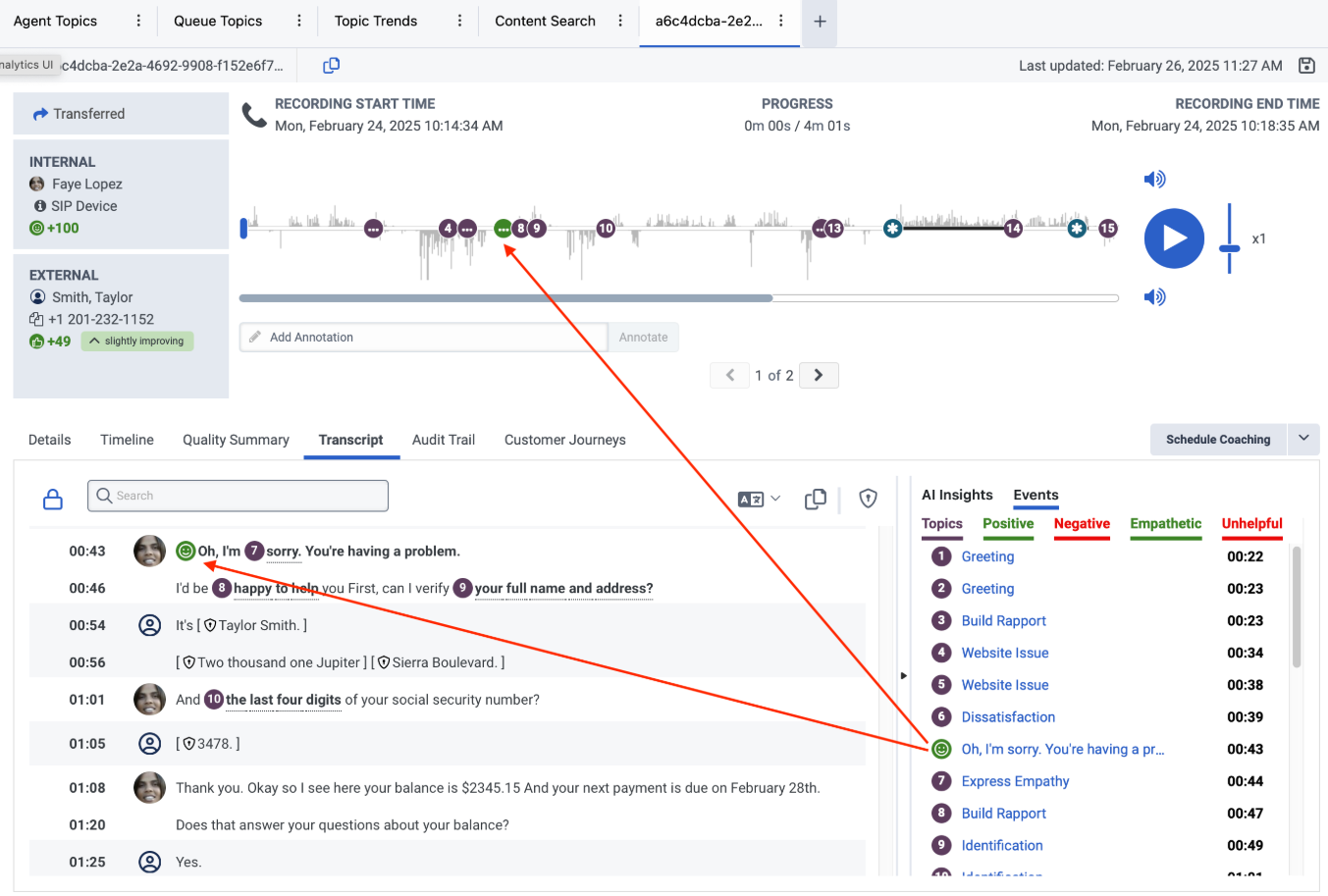 - Click a sentiment marker (green smile positive, red sad negative) on the waveform or from the Events panel, to jump to the corresponding phrase within the transcript.