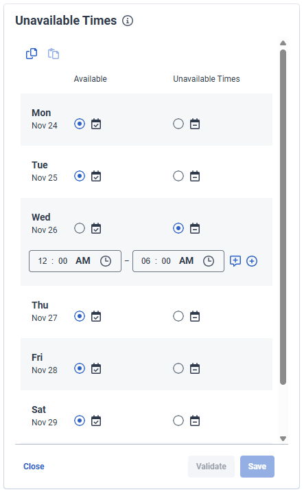 - Repeat the steps as required for other dates. Use the Copy to other weeks icon to copy the unavailable times that you have entered for the week and use the Paste icon to apply the same unavailable times onto other weeks. Whenever you paste Unavailable Times to a week, ensure to click Save so that your unavailable times are taken into account at schedule generation or reschedule. Note: When you add unavailable time entries that violate work plan constraints, such as minimum paid hours or other scheduling rules, warnings appear to alert you of the issue. You can later add or update unavailable times as needed and WFM saves these as Latest Saved in the scheduler or administrator view. During rescheduling, the scheduler or administrator can choose whether to use the Original or Latest Saved unavailable times when regenerating the schedule. For more information about rescheduling your unavailable times, see Reschedule your unavailable times section in this article.