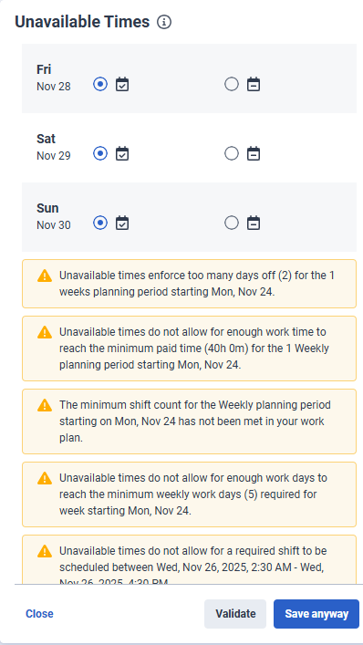 When you enter unavailable times and when it violates Work Plan constraints warnings appear, such as minimum paid hours or other scheduling rules. This means that the WFM scheduler cannot allocate a shift based on the unavailable times you have entered. As an agent, you can either revise the entered times or proceed to save your request. Your scheduler can then review it manually to adjust and ensure that your required work hours are met. For more information, see the Warning messages section in this article.